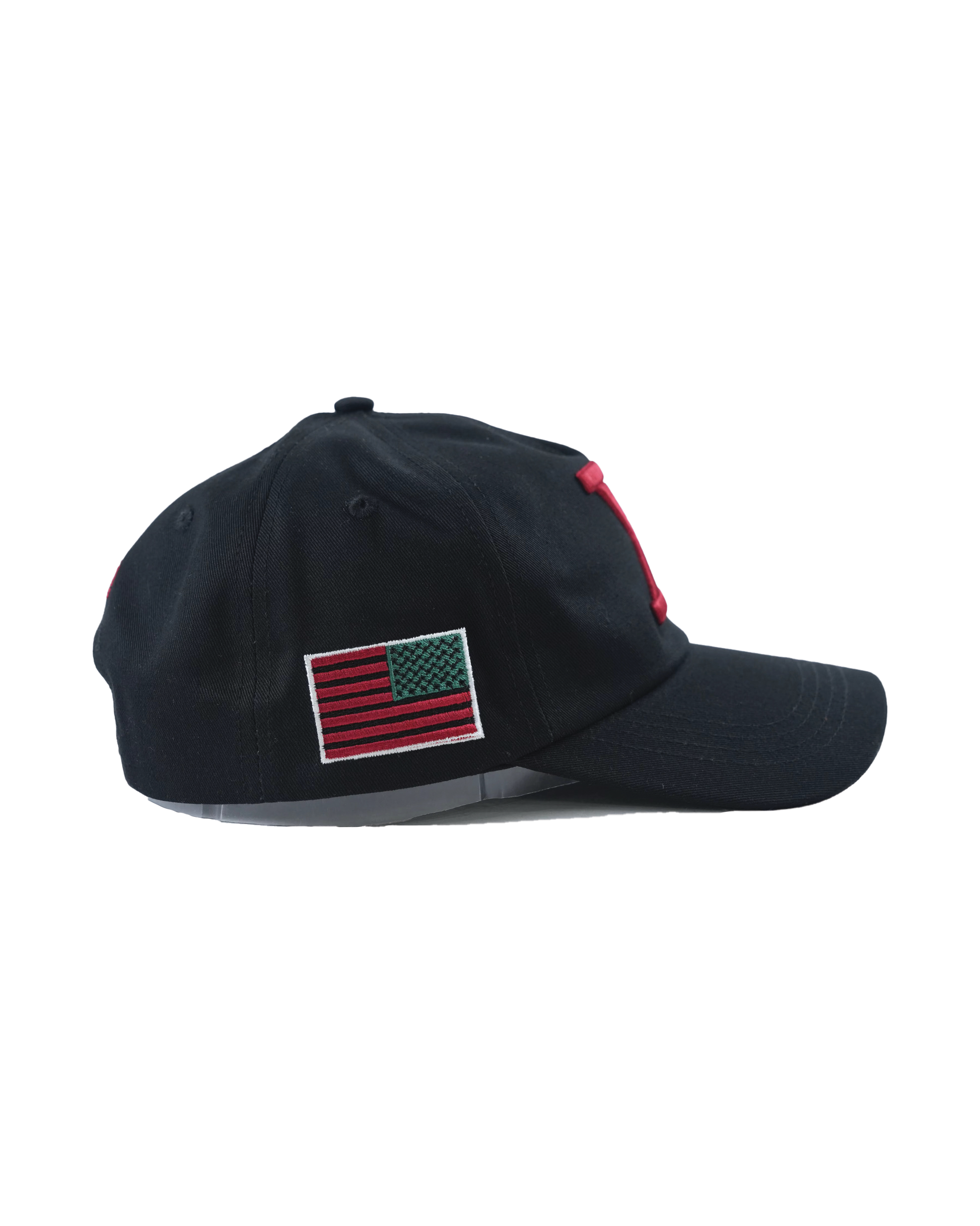 For 2026, we've decided to release a new iteration of our five panel hats. Taking reference from the 1993 Malcom X movie directed by Spike Lee. The hat includes a big bold X embroidered on the front panel. Along with adding an American Flag in green, black, and red. On the back of the hat you can see our brand new embroidered. This will be a subtle touch to showing black pride during this month and every month. The brim of the hats come flat brim out of the box but we suggest giving them a slight curve to your liking.